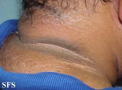 L'acantosis nigricans (enfosquiment de pell en part posterior del coll) és signe de resistència a la insulina